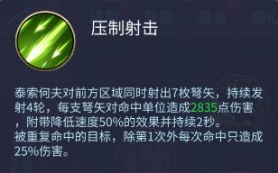 压制射击:泰索何夫对前方区域射出7枚弩矢,持续发射4轮,每支弩矢对命中单位造成2835点伤害,附带降低速度50%的效果并持续2秒。