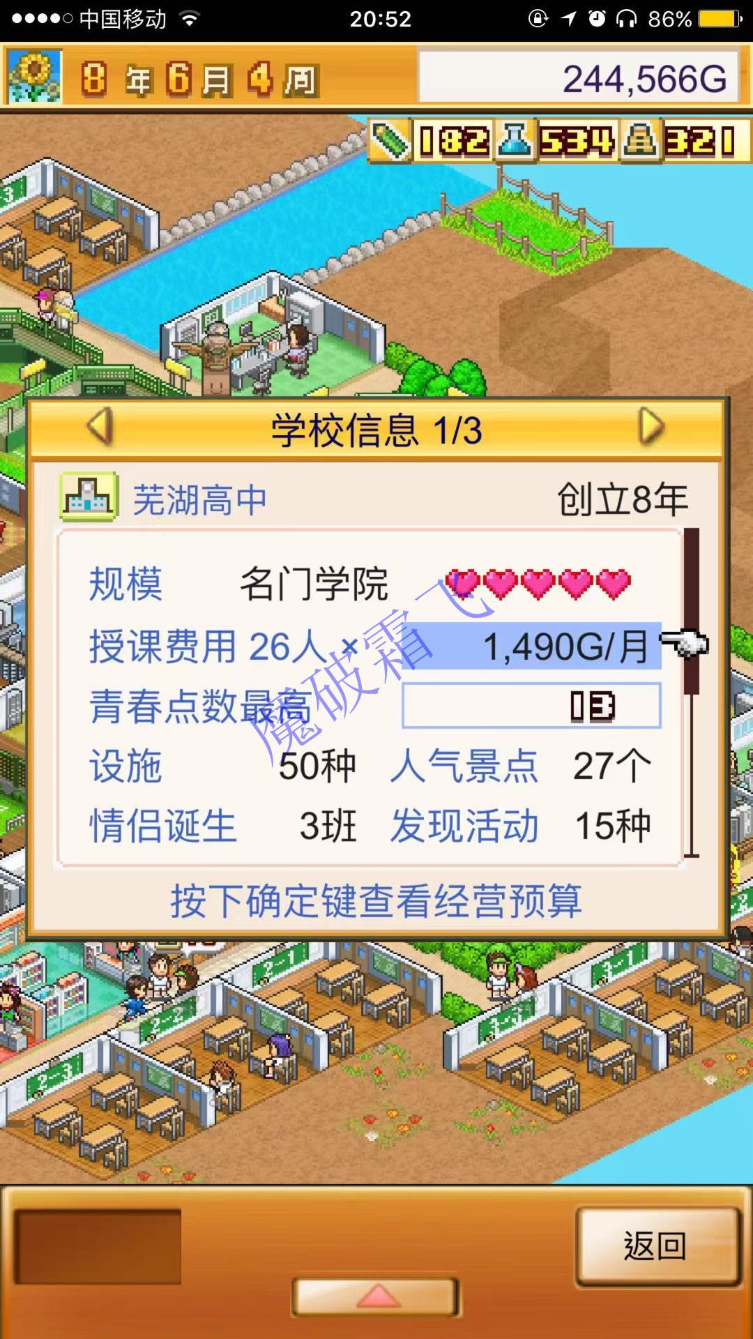 常青藤-条件:学生28人,年数20年,人气景点20个,平均分400,8个社团第一
