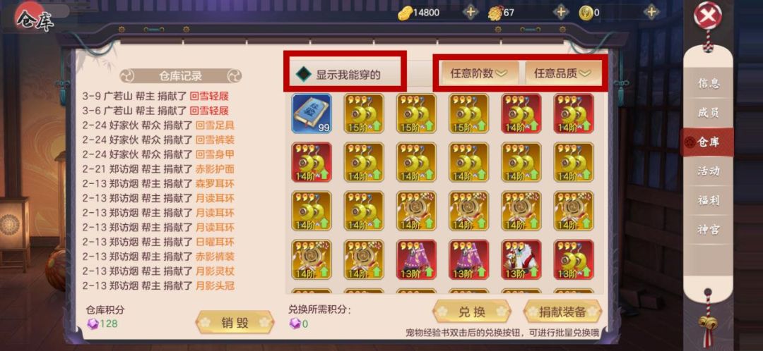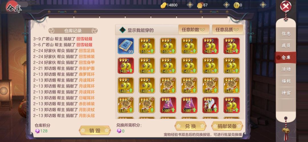 在帮派仓库中,可以看到帮派成员们捐献各种各样的装备,其中有些是我们需要的、能穿戴的,有些是无法穿戴的。