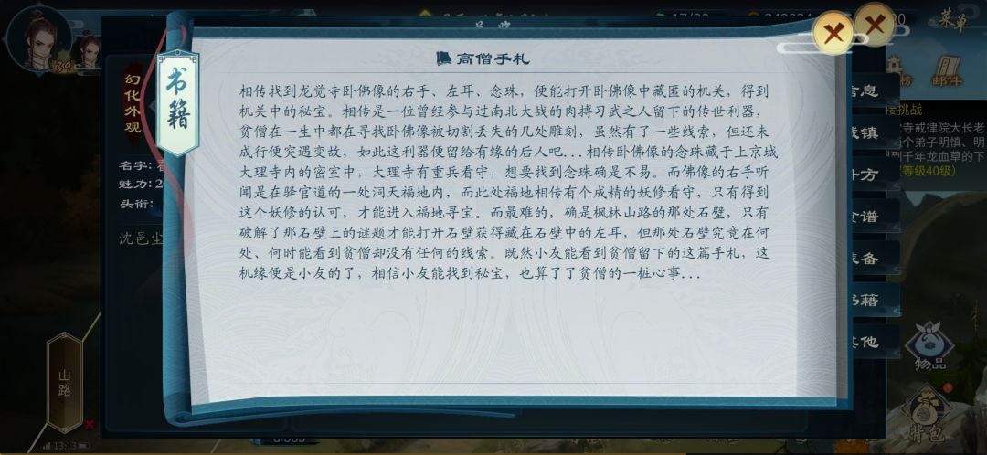 潜入大理寺找念珠会被守卫发现,守卫血量是60800,三十五级左右进去当个小BOSS刷了就行,也可以偷偷过去不惊动守卫,不过没试过,念珠就在里面,还有一件紫色霸王部件。