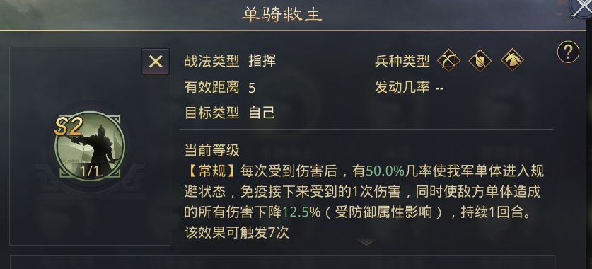 单骑救主1级时,施加的规避效果生效率也是50%,但降低敌方造成伤害这个效果受战法等级和防御属性影响,前期收益不高