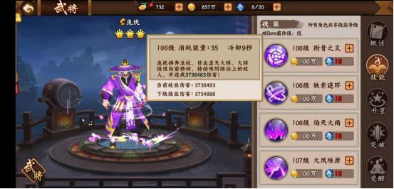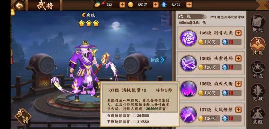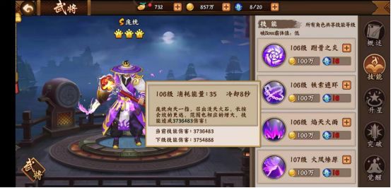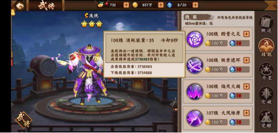 PVE玩法(试炼):全武将图鉴大招伤害最高的武将,足足比徐庶祝融之流的大招高了60%伤害。故而在试炼之地中,庞统3技能开启buff加成后,放大招后切祝融/徐庶成了常态,毕竟谁能拒绝一个摧古拉朽般的大招呢?何况特效还那么漂亮,嘻嘻。