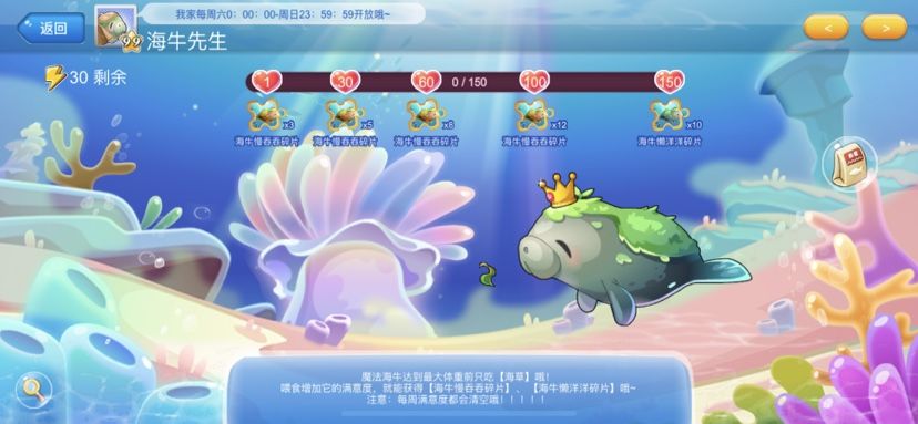 1、鱼缸等级达到22级后可拜访海牛先生的家,它的家只在每周六0点--周日23:59:59开放!