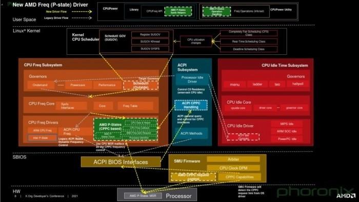 P-State”驱动程序,以利用 ACPI 协作处理器性能控制(CPPC),做出更明智的 CPU 频率缩放/性能状态决策。虽然 CPCC 初期仅限于 Zen 3 的一个子集,但经过适当的审查现已经支持 Zen 2 和更新版本 AMD CPU。