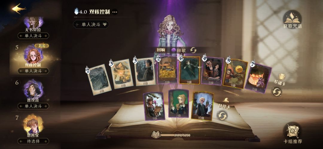 思路:双核,指的是阿瓦达和大烟花两个核心,通过低费法术解场回血来保证生存,并配合赫敏回响给高费法术减费,带了三个回费生物(嗅嗅,飞贼,画家)来保证前期节奏。