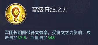 高级符文之力:军团长期佩戴符文徽章,受符文之力影响,攻击增加37.6,血量增加348