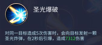 圣光爆破:对同一目标造成5次伤害时,会向目标发射一颗圣光炸弹,在2秒后引爆,造成7312伤害。