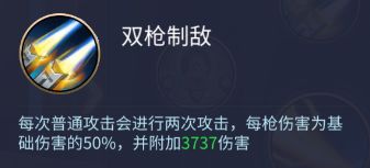 双枪制敌:每次普通攻击会进行两次公司,每枪伤害为基础伤害的50%,并附加3737伤害。