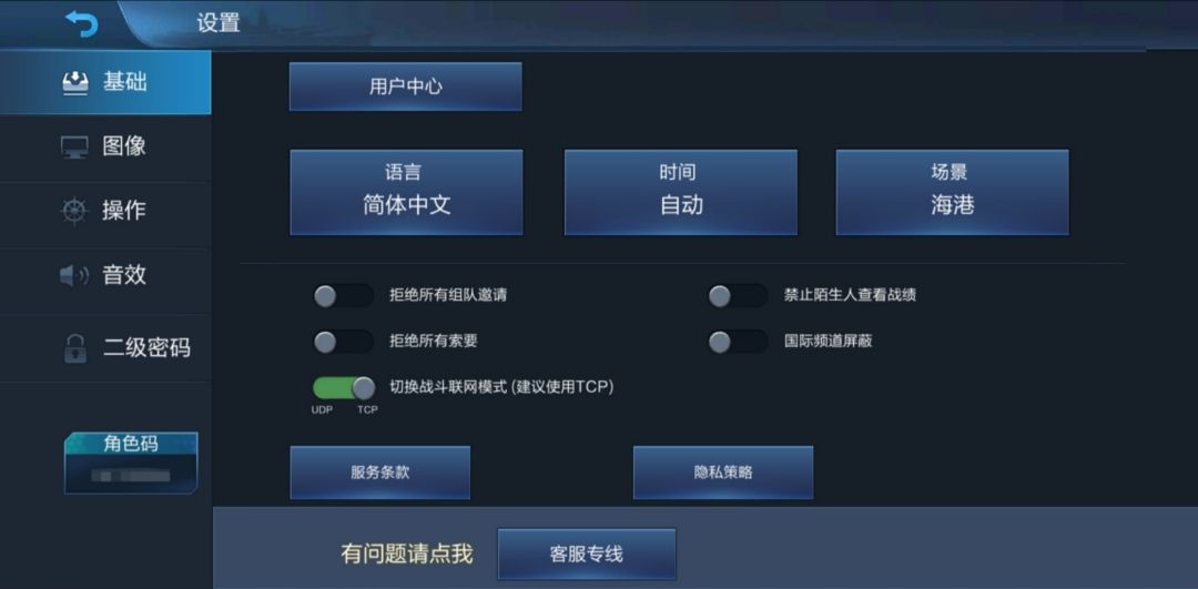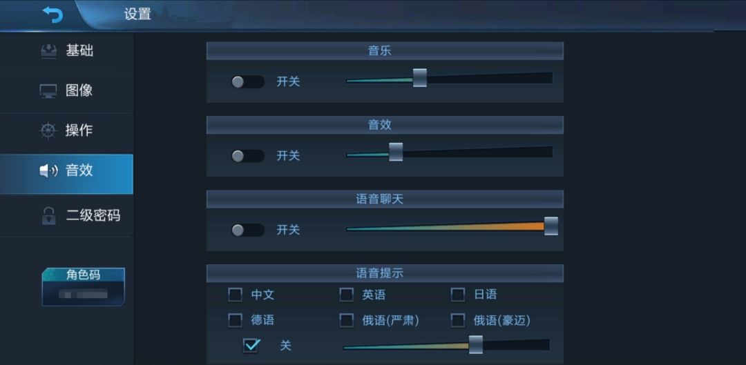 设置界面可以查看自己的角色码(左下角)。该界面一共分为基础、图像、操作、音效、二级密码五个部分。