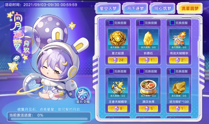 活动时间:9月24日更新后——9月30日维护更新前活动内容:流星圆梦奖励兑换开启!星之起源、各职业经验、各职业技能石等一系列珍贵奖励等你兑换。快去收集月见石,把所需资源搬回家吧!