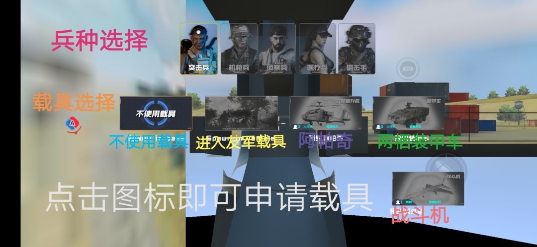 进入游戏后,屏幕会出现短暂模糊,然后弹出此界面,即可选择兵种(突击兵、机q兵、侦查兵、医疗兵、狙击手)和载具(阿帕奇、两栖装甲车、战斗机等等),点击图标进入下一步。