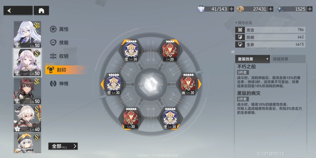 刻印是后期非常重要的核心,刻印到达30级可以提供赋能效果,6个位置同效果可以相互叠加。刻印拥有神系加成,提供刻印的20%属性。角色达到最高Ω后只需要装备2件就可以拥有3件套效果,意思就是可以装备3套刻印。