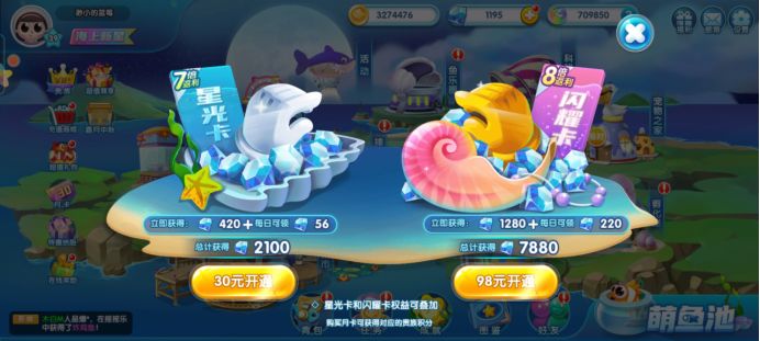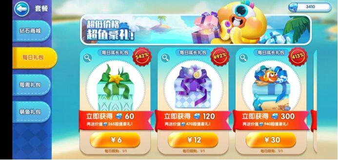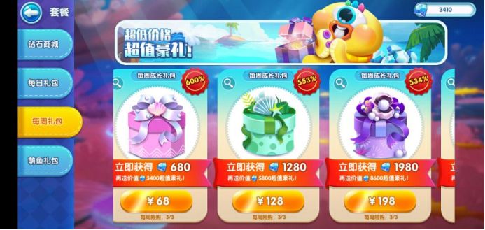 大小月卡如果可以的话我建议都买,因为都特别划算,而充钱的首选就是寄居蟹,它可以非常有效地提升你前期收集的速度。每天的六元礼包是充钱的不二之选,非常的实惠,而且还能保证每天的魔方抽奖机会,如果觉得这样冲太慢,你可以去买每周礼包。
