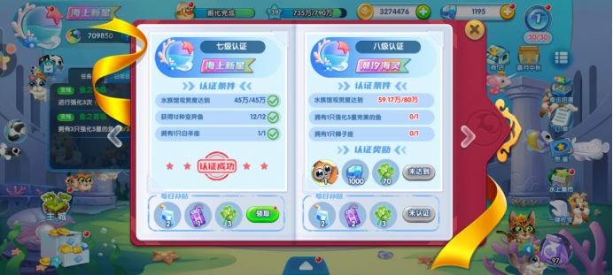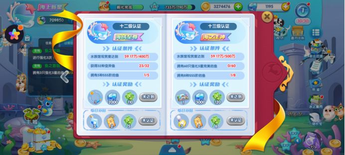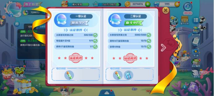 认证从一级的萌新馆长到十三级的海之主神,随着级别的增高,认证的条件也随之增高,但同样提高了我们每日补贴的奖励,而且认证成功的奖励也特别多。而认证中有三个比较难达成的认证条件,第一个观赏度,这就和观赏池、强化息息相关了,观赏池每天开业获得的爱心达到一定程度可以扩建(VIP5以上有专属观赏池容量),从而提高观赏度,而另一种就是强化鱼来提高了,鱼池背景和宠物也可以提高观赏度。第二个就是五星完美鱼,这个在下一级认证是最后一个条件时,可以用商店里可以买的D级鱼去叠上去,因为强化几率高,而且容易获得和皇冠时间短。最后一个是变异鱼的种类,这就没有什么好方法了,除了把鱼屯到变异周,就只能看命了。