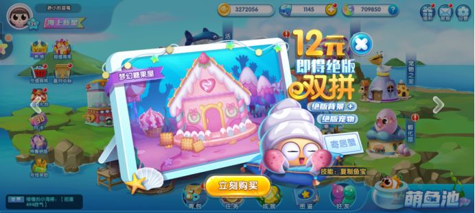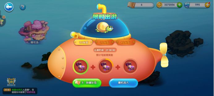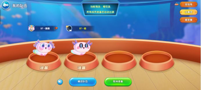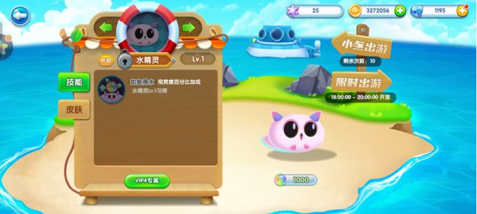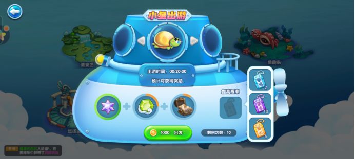 现在总共有三个宠物,分别是金钱龟(每天三百次,每次可以获得金币,有几率金币变成一个钻石,初始宠物)、水精灵(增加百分比观赏度,V4可得)、寄居蟹(复制鱼宝,12元专属礼包可得)。每天十次出游机会,出游可以获得海洋之心、绿晶突破石和宝箱。海洋之心可以提高宠物等级,宠物等级提高可以增加观赏度,宠物每十级可以用绿晶突破石突破一次(水精灵需要用白灵突破石,V4以上每日礼包可领),宝箱里有各种奖励,比较重要的是海岛图纸和各种鱼的碎片,现在有四个岛,海岛图纸可以用来开后面三个岛,出游可以用幸运符提高获得出游获得的几率。限时出游是在限定的时间内出游,不消耗每天的出游次数,创建队伍就需要五个海岛图纸,也可以加入队伍白嫖(活动刚开始的时候大佬比较多可以白嫖),最终可以获得樱花岛宝箱,宝箱内不仅有樱花鱼蛋和基础奖励甚至有扭蛋劵和电池等好的奖励。