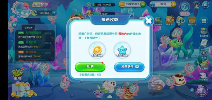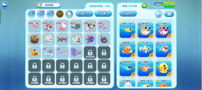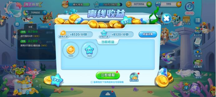 离线收益是在喂食后会产生金币经验,这让我们玩家可以佛系的玩游戏,VIP5以上离线收益有金币加成,快速收益是获得当前池内一个小时的金币和经验,每天有一次免费和三次看广告机会,剩下五次就要用钻石了,建议使用快速收益的时候把自己最好的鱼都放进去,这是快速升级和获得金币的不二之选。(如果缺金币的话,招财猫是特别好的选择,它是金币收益最高的,没有之一)