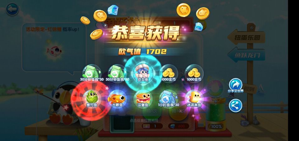 扭蛋可以获得各种鱼和其他一些奖励,每天都会有一次免费的机会,十连抽会显示出玩家抽奖的欧气,如果抽到的东西不好也不要灰心,命运总是有好有差,相信自己你会有更好的运气的