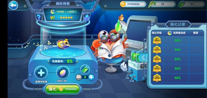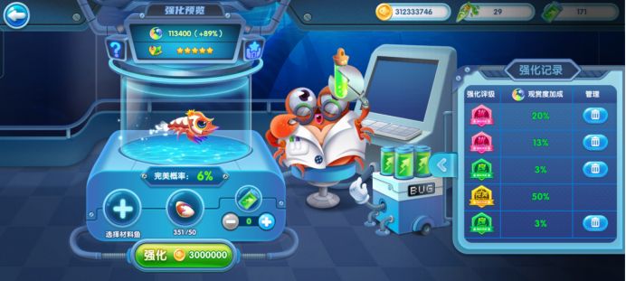 强化于三十级开启。强化需要一样的鱼和其对应的鱼宝去强化鱼,让鱼拥有更高的观赏度,强化等级分为完美、优秀、良好,而强化出完美会让鱼拥有漂亮的拖尾特效,拥有越多完美的鱼拖尾越好看,最高评级是五完美,不同等级的鱼强化出完美的几率不一样,等级越高的鱼几率越小,我们可以通过遗忘药水遗忘之前强化的评级,也可以通过电池提高强化完美的几率。