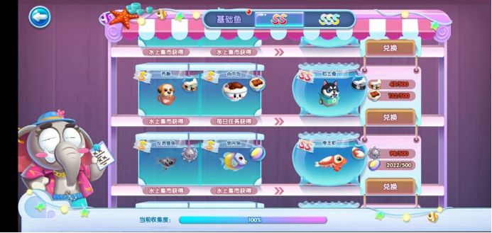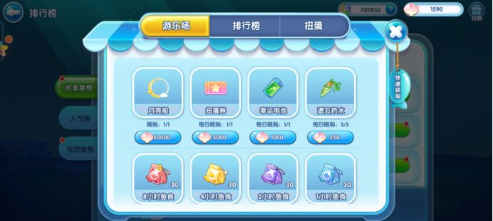 兑换商店分为游乐园、排行榜和扭蛋。游乐场需要玩三种小游戏来获得积分,玩小游戏还可以获得小礼包。排行榜的奖励有每天的观赏度榜和每周的人气榜,观赏度榜根据每天晚上九点观赏池的观赏度在该段位榜上的情况发放积分,人气榜则是一周每天开业获得的人气总和发放钻石、金币、电池、遗忘药水和积分。扭蛋商店则是每抽奖一次获得一积分,在商店中兑换从A到SSS的鱼。