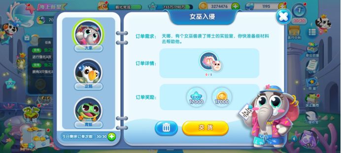 订单会需要不同鱼的鱼宝,可以获得金币、经验和精华。每天都有三十个订单,玩家可以把没用的鱼宝用来提交订单。VIP到一定程度可以增加订单。