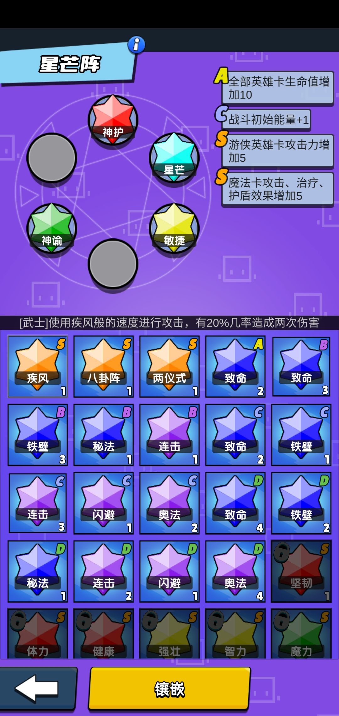 好在有游侠攻击和效果+5,初始能量+1确保死一个就可以开盾,加生命提高生存