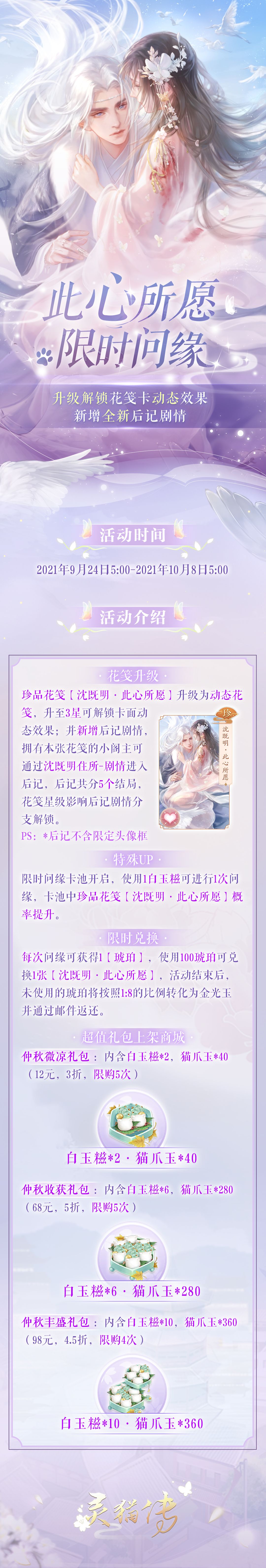 9月24日5:00-10月8日5:00限时开启沈既明个人活动,珍品花笺【沈既明·此心所愿】升级为动态花笺,升至3星可解锁卡面动态效果;并新增后记剧情。活动期间限时问缘卡池开启,使用1白玉糍可进行1次问缘,卡池中珍品花笺【沈既明·此心所愿】概率提升。