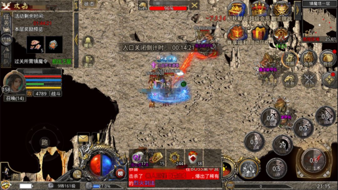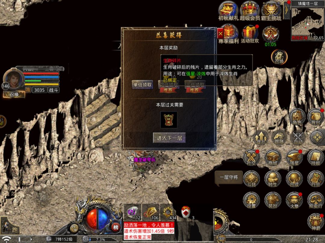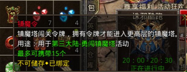在我们每次打完这个活动时可以拿完奖励后,再打满令牌为下次活动做好足够的准备,一般打满15个后在第二天就能够跑到六层镇魔塔,领先其他玩家一步