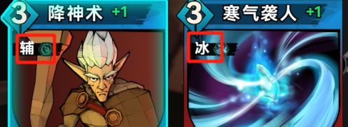 每张卡牌都有对应的属性,每种属性达到一定数量后就可以凑出对应的套牌效果,如图所示,两张卡分别是辅助和冰。