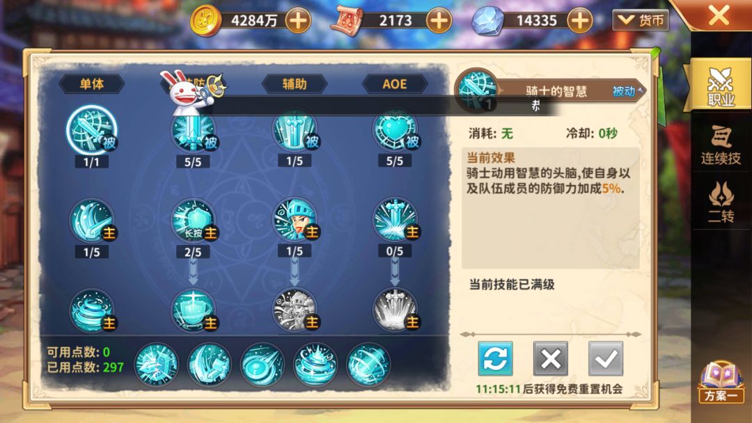 ● 技能:武器破坏、防具破坏、全力一击、大霹雳、点击、盾挡、飞毛腿。(技能格子只有5个,已经懒得吐槽了,看情况搭配吧。)