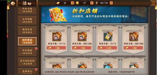 值此中秋佳节来临之日,游戏分别于 9月21日~9月22日、9月23日~9月24日活动期间内,开放两个时段的折扣商城。