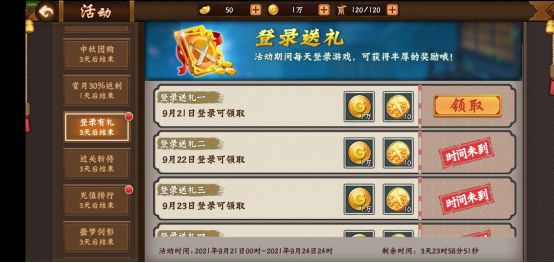 1、你登我送之登录送礼:玩家在 9月21日-9月24日活动期间内登录手游,即可领取限时活动道具“纪念币”和“金币”。