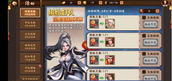 第一时段( 9月21日~9月22日)上架贩售“祝融/周瑜/姜维升星暴击箱、高级招募卡、陨铁、洗练石、洗练锁”等各类养成资源。