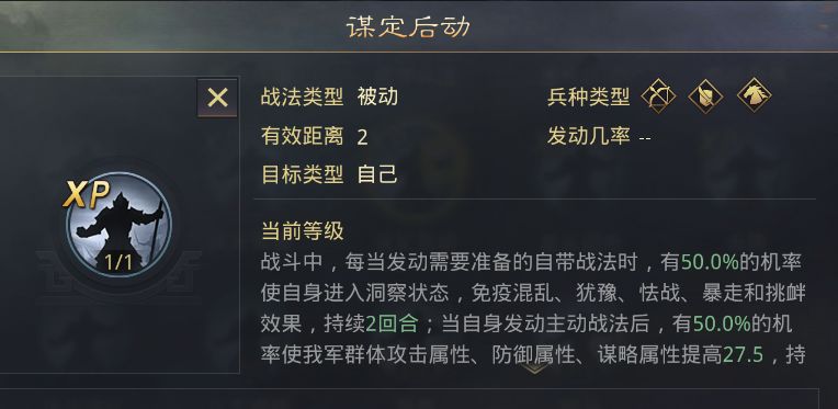 4.带谋定后动的武将,自带战法最好是比较关键的战法,比如XP关羽的自带战法有非常不错的控制和伤害,很适合带谋定后动。