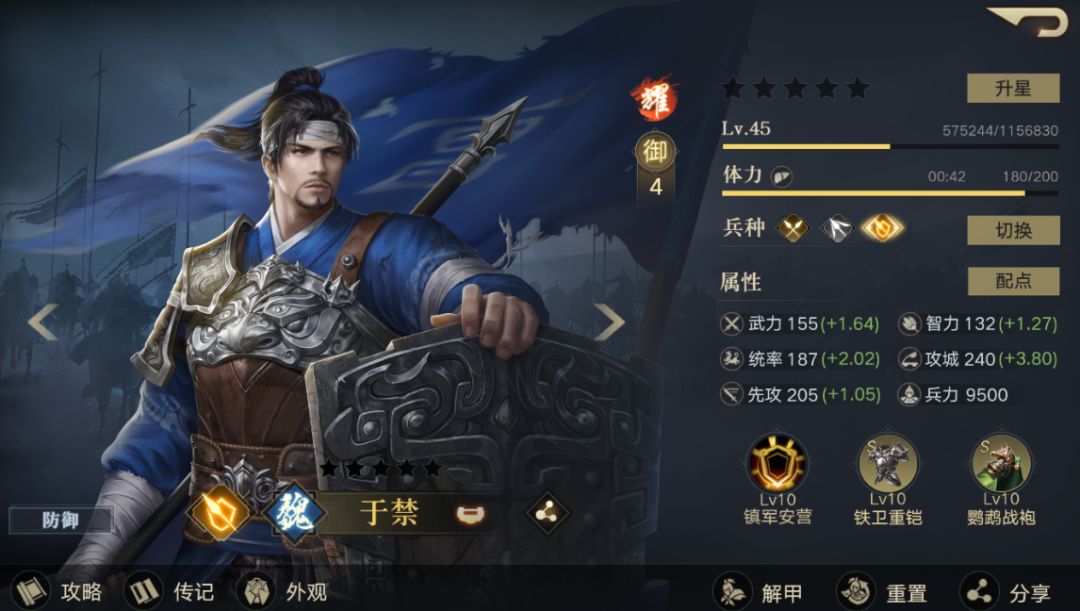于禁铁卫重铠15%+鹦鹉战袍24%+铁甲兵8%+兵种战法坚守阵地8%+镇军印25%=80%