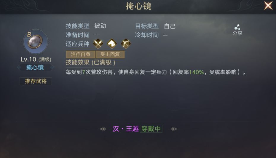 宝具王越推荐护心镜+兽裘,回复倍率比潜龙铠要高,一个是相当于8次回140%一个是7次回140%。兽裘保证你可以稳定武力减伤30%配上护盾,肉肉的更有安全感。