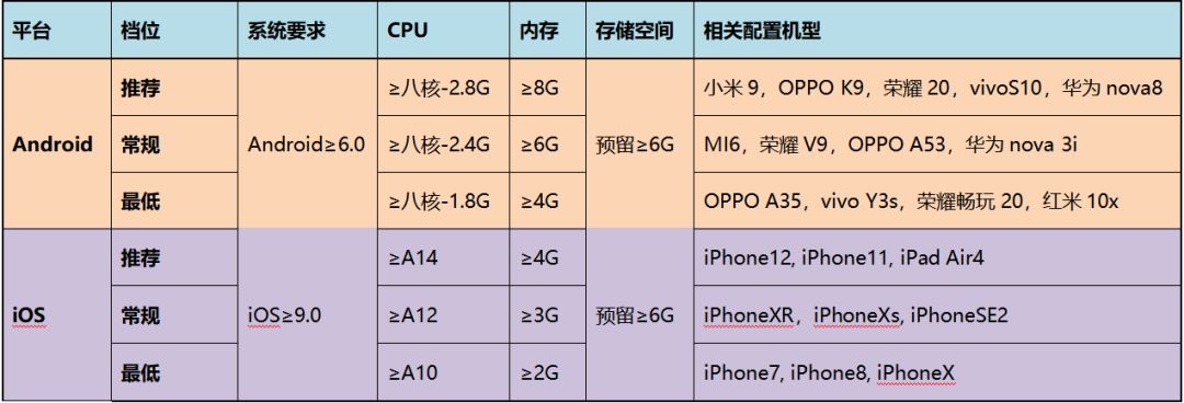 A:为了确保您的设备能顺利运行游戏请您确认手上的机型是否符合最低配置要求,设备配置及相关配置机型如下: