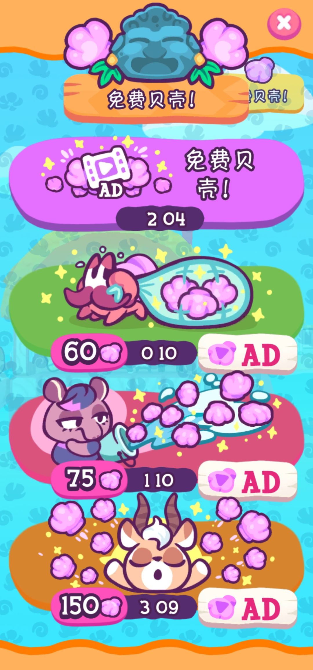5.小屋门口会出现小动物,点击可观看广告,获得贝壳(数量50~150不等)