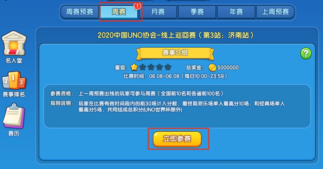 最后,另一点很重要的事情大家不要忘记,那就是周赛也在今天(6.8)上午10点正式打响,晋级的小伙伴记得去巡回赛的界面主动点击“立即参赛”来报名哦,这次不像是周预赛会自动报名,要大家主动点击了呀~