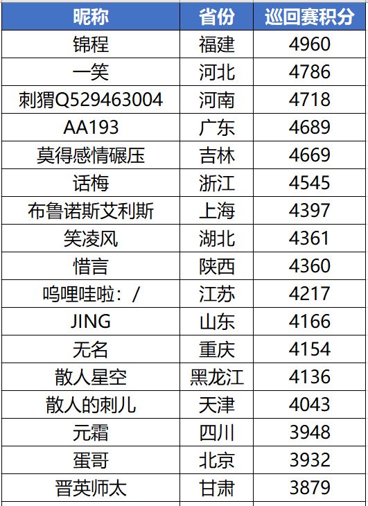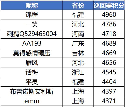 排名首位的是来自福建的“锦程”,总共拿到了4960的恐怖战绩,将近5000分的成绩也给巡回赛第一站创下了一个难以超越记录,不知道之后的各站的小伙伴能不能突破5000的大关,成功“破纪录”。