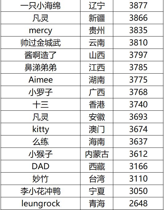 首先是全国排行榜的top10,这10个人和半程战报相比,变化可谓是超大,竟然10位大佬都是崭新的面孔!