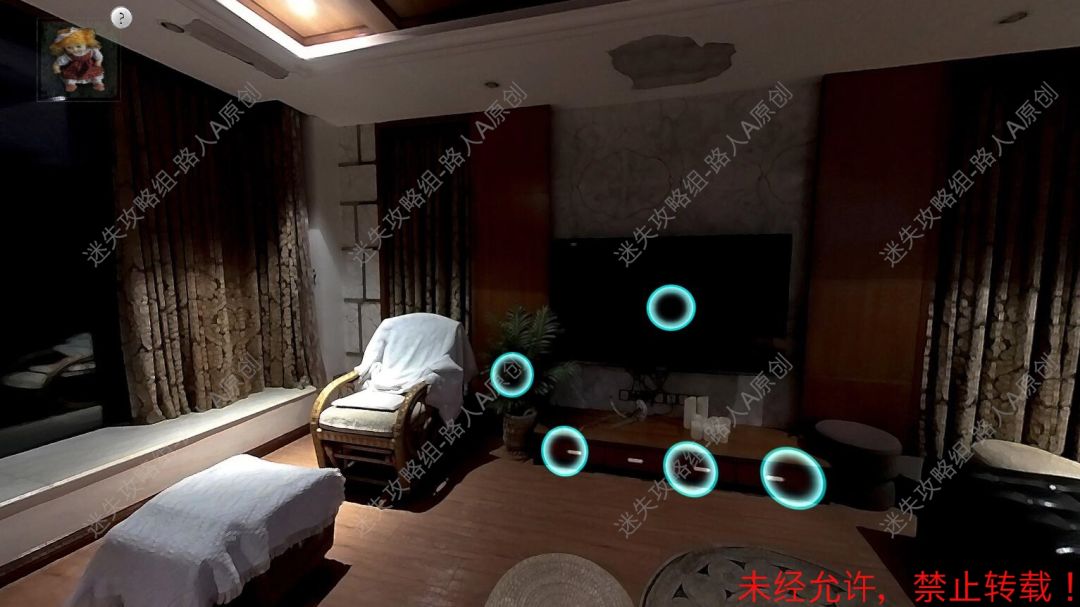 8.点击闪烁的圆框,收集【洋娃娃】、【期末满分试卷】、【两张收据】和【诊断报告】。(调查完所有圆框:电视、电视下的抽屉、盆栽、扶手椅。)8.1