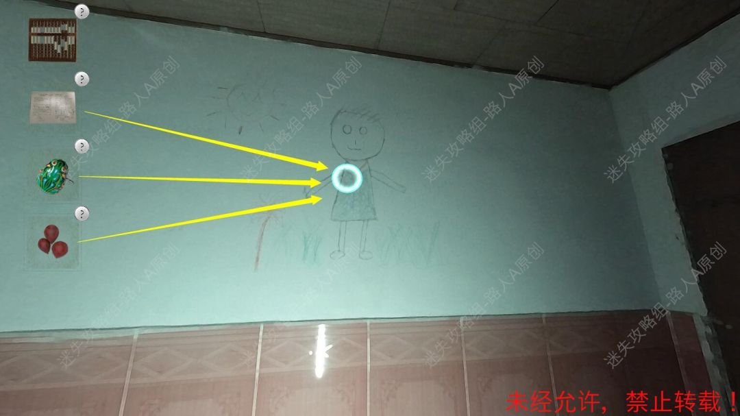 22.对墙上的涂鸦使用【试卷】、【玩具】和【气球】,涂鸦出现红色眼睛并且看向门边。21.1