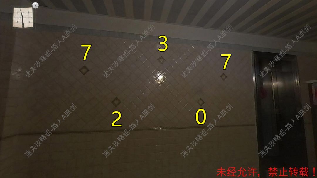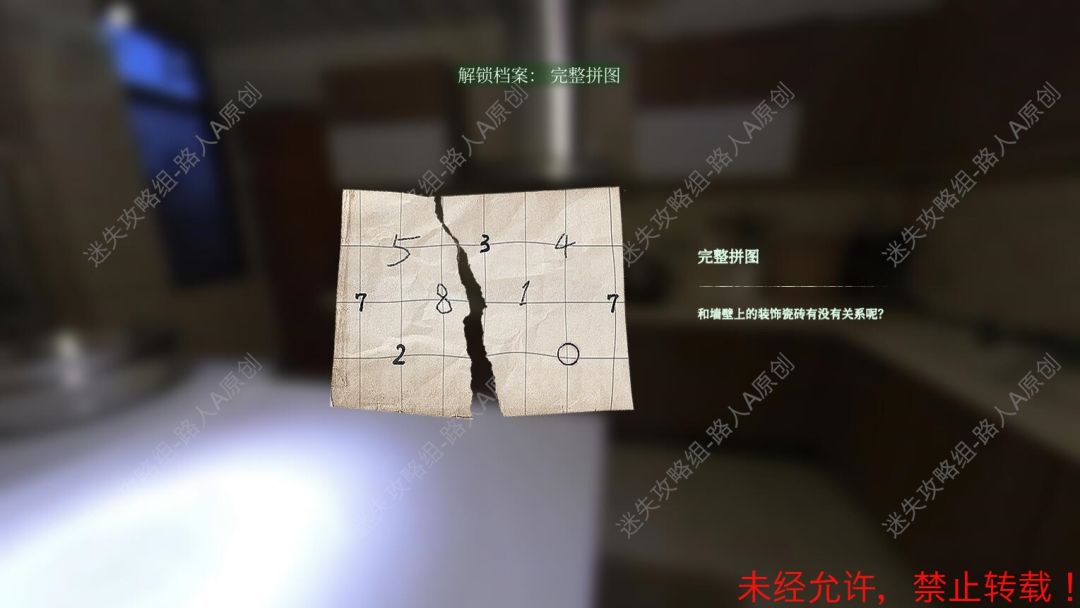 14.对比【完整拼图】和【墙上的瓷砖】,根据瓷砖的位置找出对应数字,再从左往右排列,得到密码【72307】。14.1