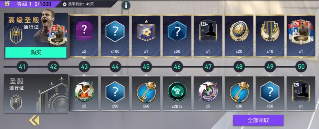 -通行证总等级为50级,每升1级需要1000点,升满共计需要49000点。