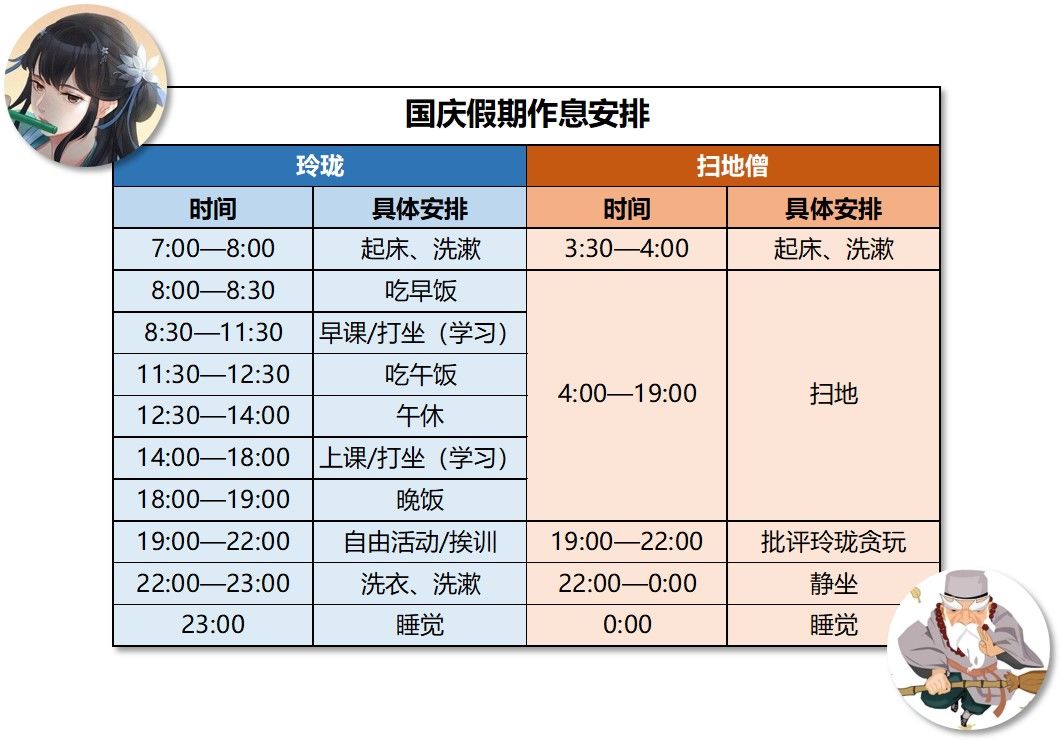 好在用不了几天,咱们就将迎来另一个超长假期:国庆节!在举国欢庆的日子里,闭关修行还是出门远行,各位道友心里是否早已做出了选择?如果道友们还没有计划,不妨参考参考这份玲珑和扫地僧的日常作息计划表,或许能给你带来一些启发哟!(仅供娱乐,切勿模仿扫地僧作息(*^▽^*))