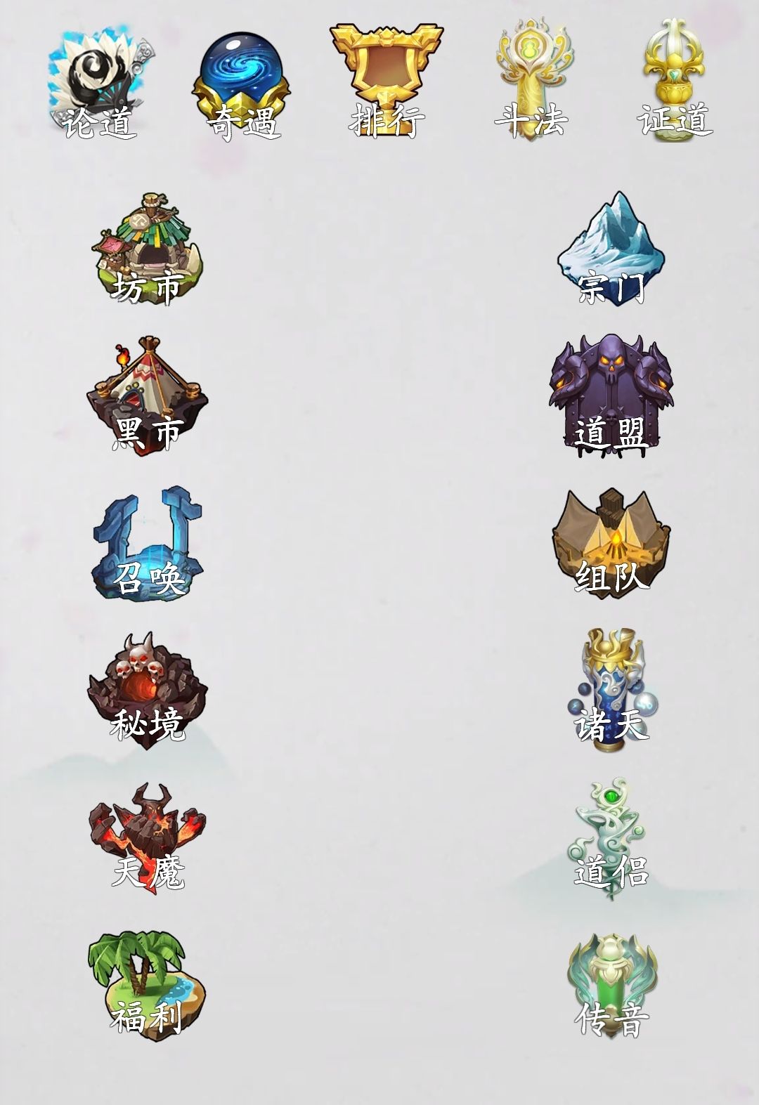 1.论道:每天打十次,尽量早打的过的打,奖励多一倍(要是都打不过也没关系,一小时可以刷新一次,要是还是打不过也没关系,只要你突的够快)
