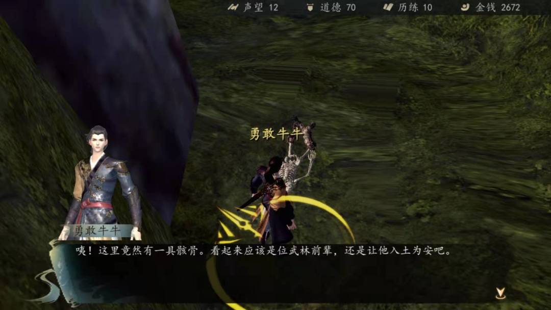 以上完成就终于可以出村啦,先在村口存个档(存到最下面备用),然后往前走遇到受伤的丐帮弟子,我们先暂时选择不帮(帮了就是走抗倭路线,到时候用备用存档走抗倭线)