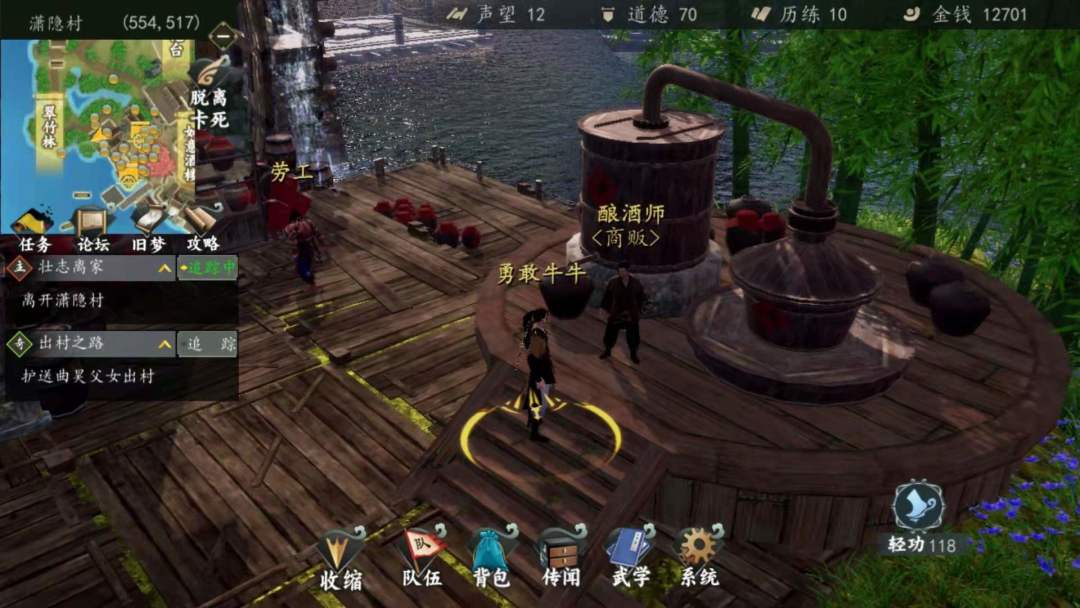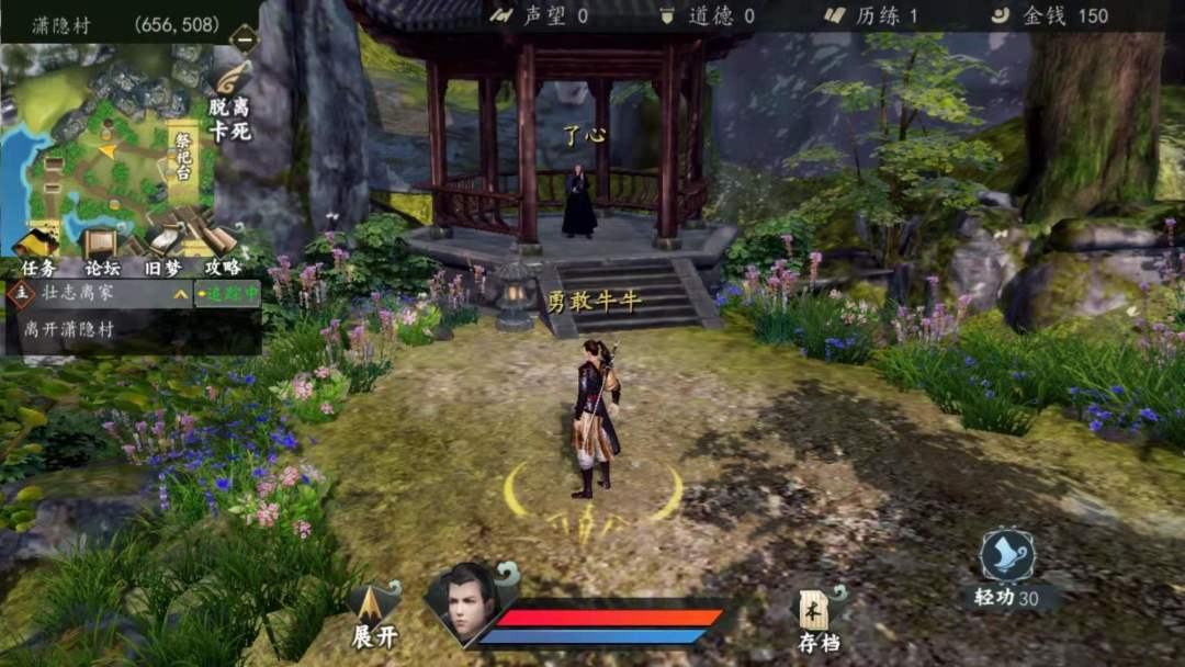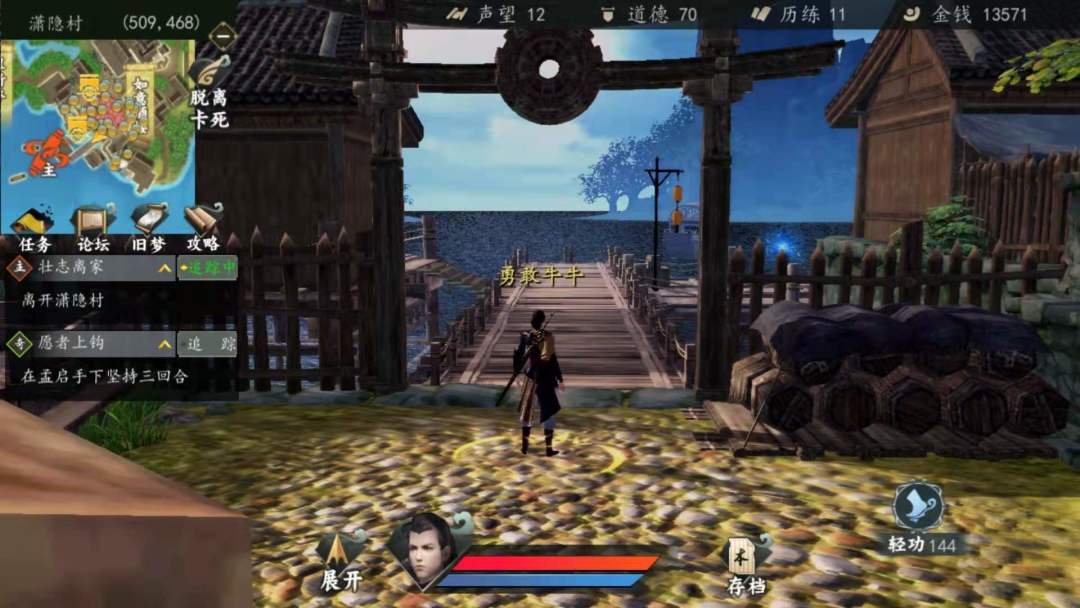 7. 突然,主角老爸被吵醒chuachua两下飞走了,你跟着回家告诉老爸自己要闯荡江湖,老爸最终同意了,还是放心不下,于是传了主角《满江红》,随着剧情你来到了渡口(这个时候我们先不出去,去做支线任务)