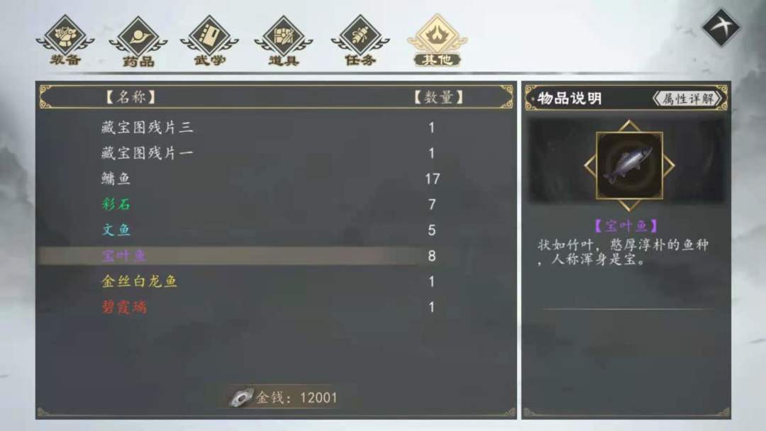 最后我们去垂钓点钓鱼,把鱼饵钓完,钓到的<神农本草经>装备上,<宝叶鱼>去酒楼掌柜那换钱,其他的鱼也卖掉换钱