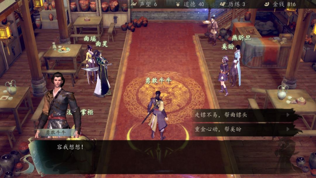 进入酒楼碰到有人劫曲昊的镖,你选择帮曲镖头,一番战斗后,他要你带他出村(在这先不出村,做完所有任务在出)